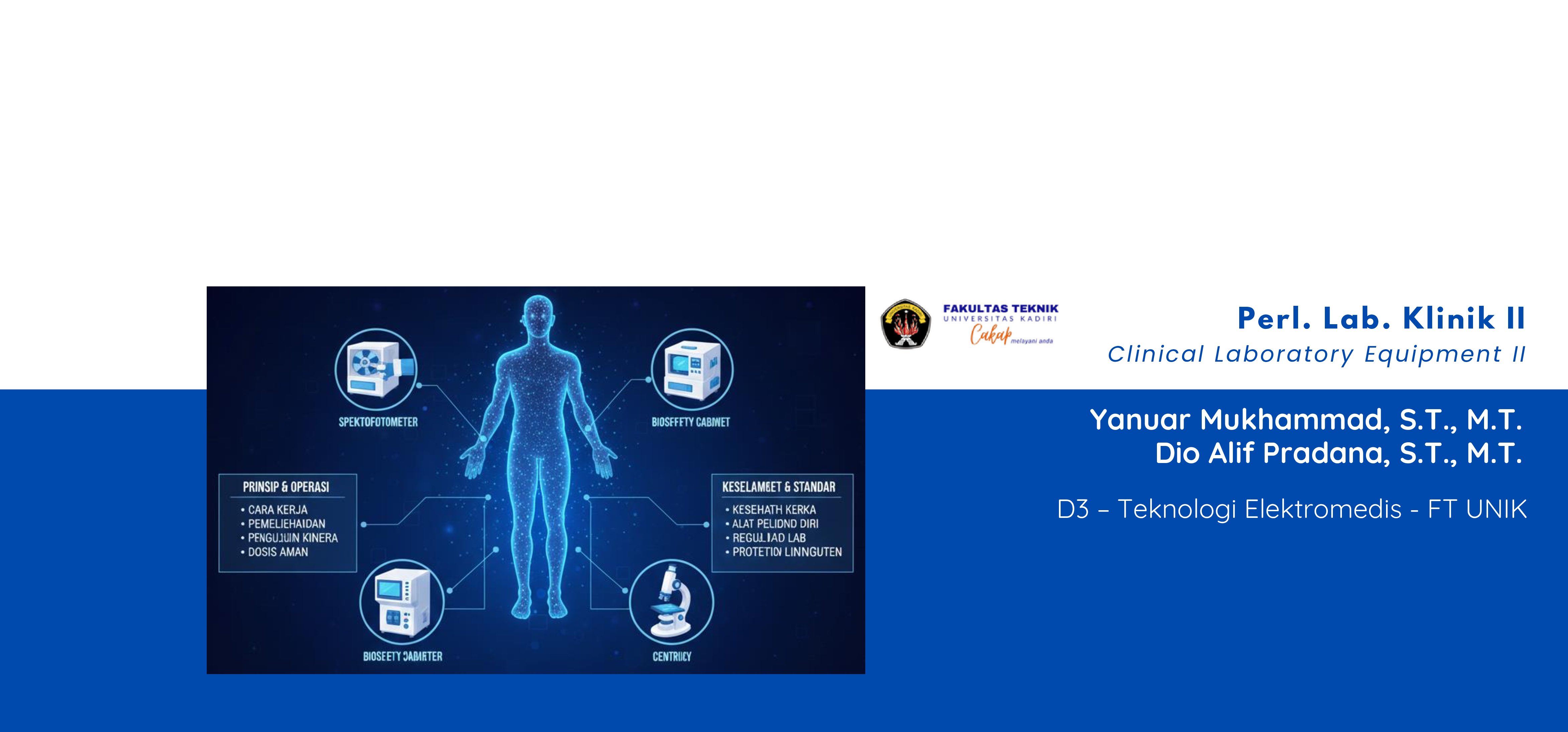 Mata kuliah ini membahas konsep dasar, prinsip kerja, dan aplikasi peralatan labortaorium klinik II yang digunakan dalam pelayanan kesehatan. Mahasiswa akan mempelajari teori dan praktik terkait pengoperasian, pemeliharaan, pengujian, serta keselamatan kerja dalam penggunaan peralatan diagnostik dasar, seperti Spektrofotometer, Biosafety Cabinet dan peralatan klinik lainnya. Mata kuliah ini juga menekankan pentingnya penerapan standar kesehatan dan keselamatan kerja untuk melindungi pasien, operator, dan lingkungan sesuai dengan kompetensi dasar teknisi elektromedis.