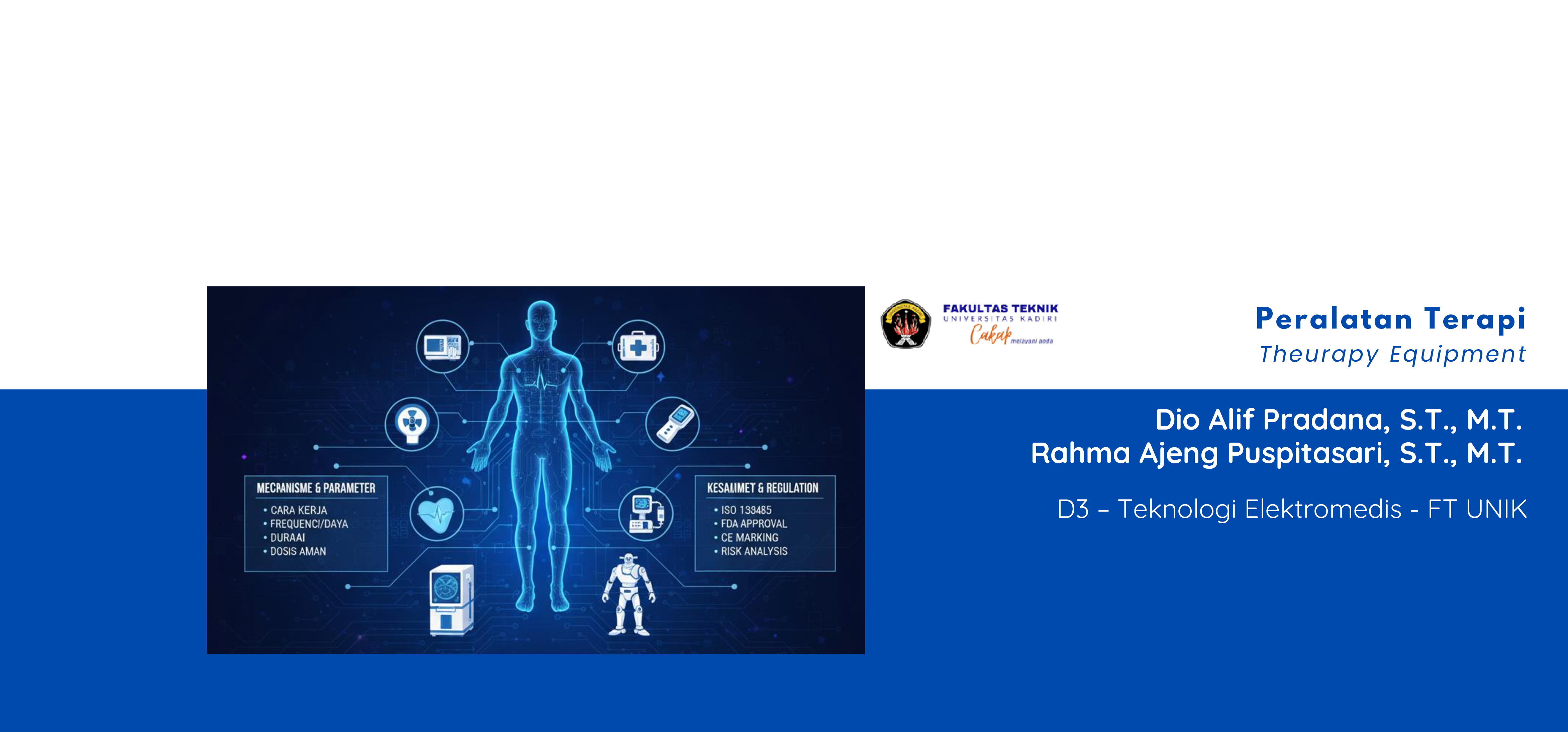 Mata kuliah ini membahas prinsip dasar dan konsep teoritis berbagai modalitas terapi yang digunakan dalam praktik teknik biomedis dan klinik. Materi mencakup mekanisme kerja, parameter operasional, aspek keselamatan, standar regulasi, serta evaluasi kinerja peralatan terapi medis. Penekanan diberikan pada integrasi antara prinsip rekayasa dan kebutuhan klinis untuk memastikan penggunaan alat yang aman, efektif, dan sesuai standar. Mahasiswa diharapkan mampu menganalisis fungsi alat terapi, mengidentifikasi risiko, serta mengevaluasi kesesuaian operasional berdasarkan standar keselamatan dan regulasi yang berlaku.